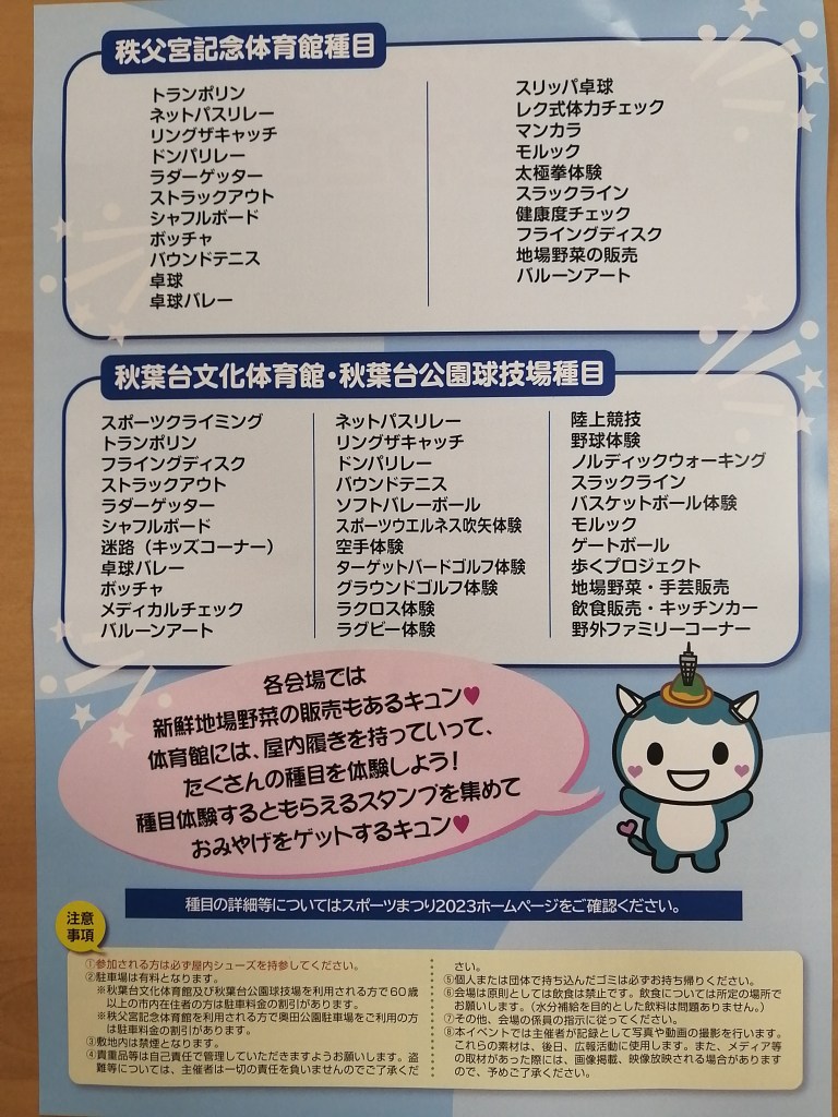 スポーツ祭りが開催されます 11/12 9:00-15:00秩父宮記念体育館秋葉台文化体育館秋葉台公園球技場